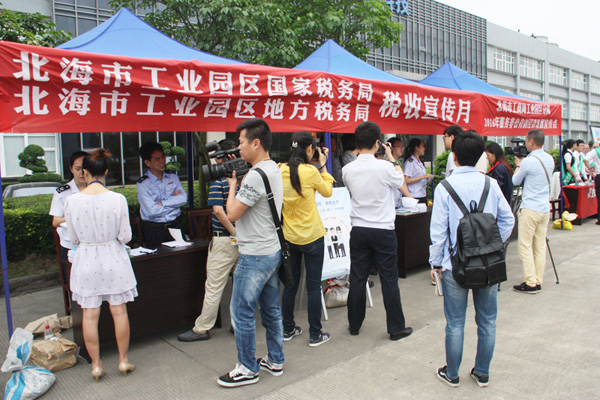 2016年4月19日,北海市工業(yè)園區(qū)國稅局、地稅局、工商局工業(yè)園區(qū)分局、農(nóng)業(yè)銀行北海分行走進北海工業(yè)園區(qū),在中國電子北海產(chǎn)業(yè)園現(xiàn)場為企業(yè)宣講營改增、解讀稅收優(yōu)惠政策、服務非公有制經(jīng)濟發(fā)展及金融服務。
